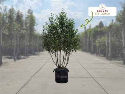 Prunus lusitanica ‚Angustifolia‘, mehrstämmig, auch als Portugiesischer Kirschlorbeer bekannt, hat schmalere, längliche Blätter. Diese sind glänzend dunkelgrün und bleiben das…