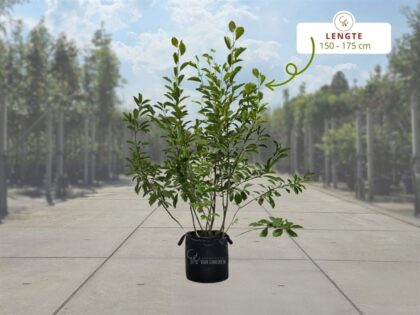 Prunus lusitanica ‚Tico‘ Spalier, auch bekannt als Portugiesischer Kirschlorbeer Spalier. Diese immergrüne Baum trägt glänzende, dunkelgrüne Blätter mit einem roten…