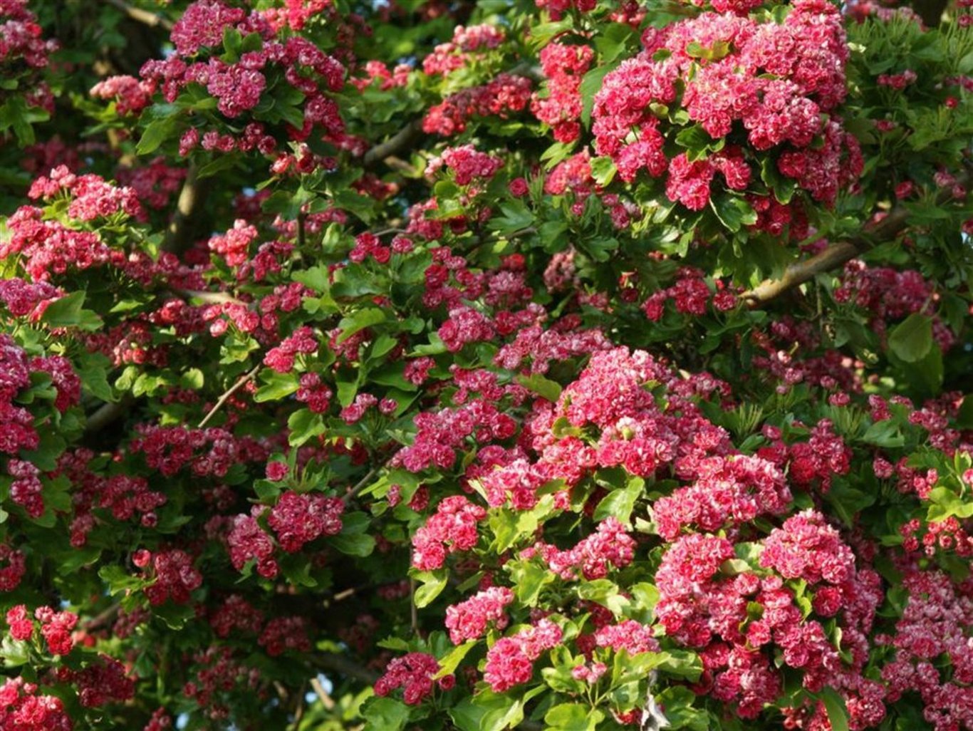Crataegus Media „Paul’s Scarlet“, auch bekannt als Echter Rotdorn, hat eine breite, kegelförmige Krone mit dunkelgrünen eiförmigen Blättern. Im Frühjahr ist der mehrstämmige Baum komplett mit roten Blüten bedeckt. Die Zweige haben 2,5 cm lange, sehr scharfe Dornen. Dieser mehrstämmige Baum ist in kleineren Gärten beliebt und verbreitet eine gemütliche Atmosphäre. Für sandige Böden geeignet.