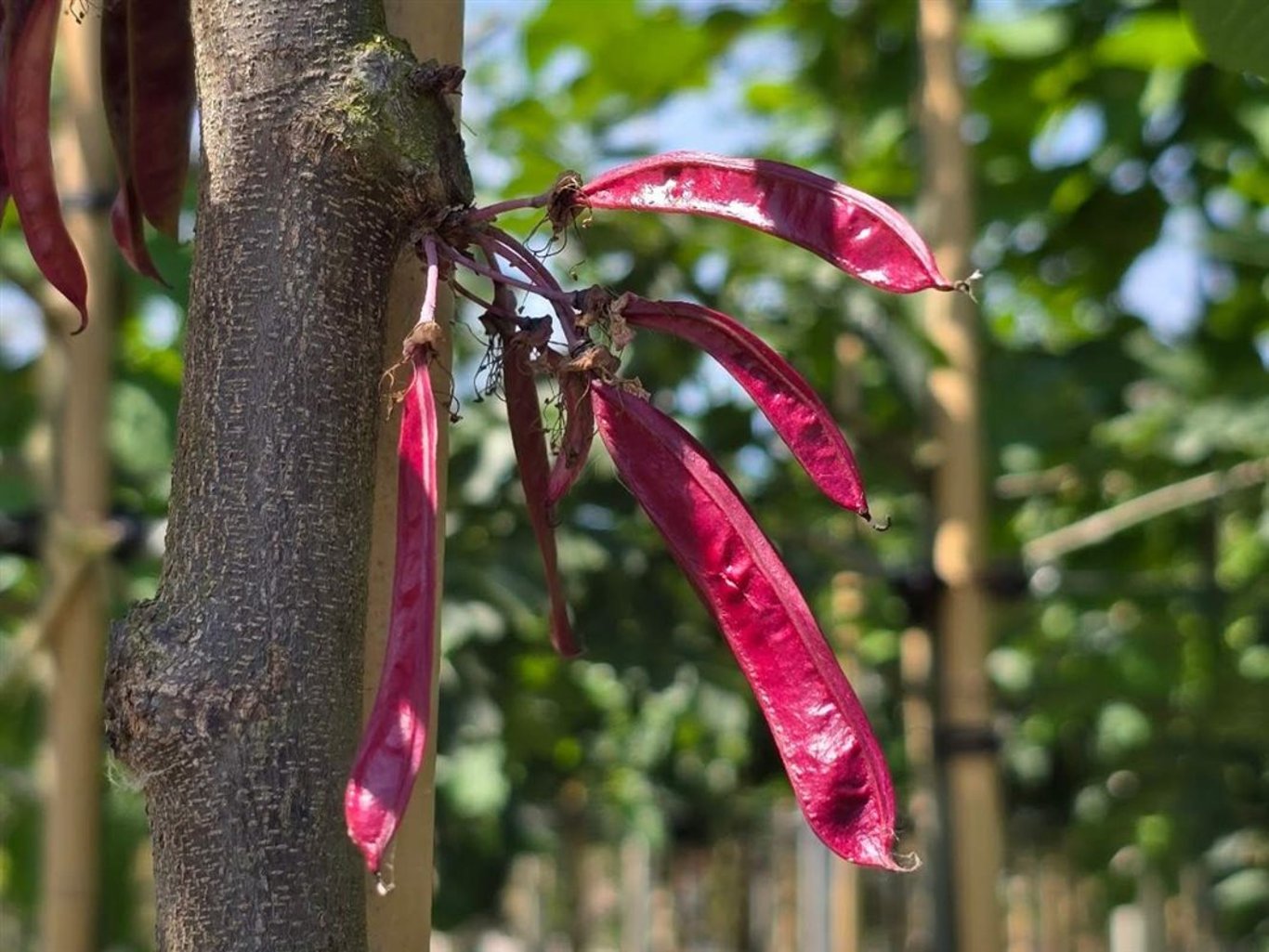 Cercis siliquastrum Mehrstämmig, auch als Judasbaum Mehrstämmig bekannt, ist ein Zierbaum mit einer Wuchshöhe von 6 bis 8 Metern. Im zeitigen Frühjahr blüht er üppig mit rosa-violetten Blüten, die direkt an den kahlen Zweigen erscheinen, noch bevor die Blätter austreiben. Die herzförmigen Blätter glänzen grün und färben sich im Herbst gelb. Nach der Blüte bilden sich dekorative, flache Schoten, die oftmals bis in den Winter am Baum bleiben.