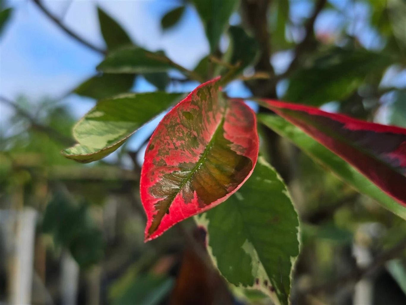 Die Photinia fraseri ‚Pink Marble‘ Mehrstämmig, auch bekannt als Glanzmispel, ist ein wunderschöner immergrüner Baum. Er ist bekannt für seine farbenfrohen Blätter. Das Laub ist bunt gemischt in Kombination aus Grün, Weiß und Rottönen. Im Frühjahr erscheinen neue Triebe, die zunächst rot sind und später in ein Muster aus Rosarot und Grün mit weißen Rändern verblassen. Er kann eine Höhe von 2 bis 4 Metern erreichen.