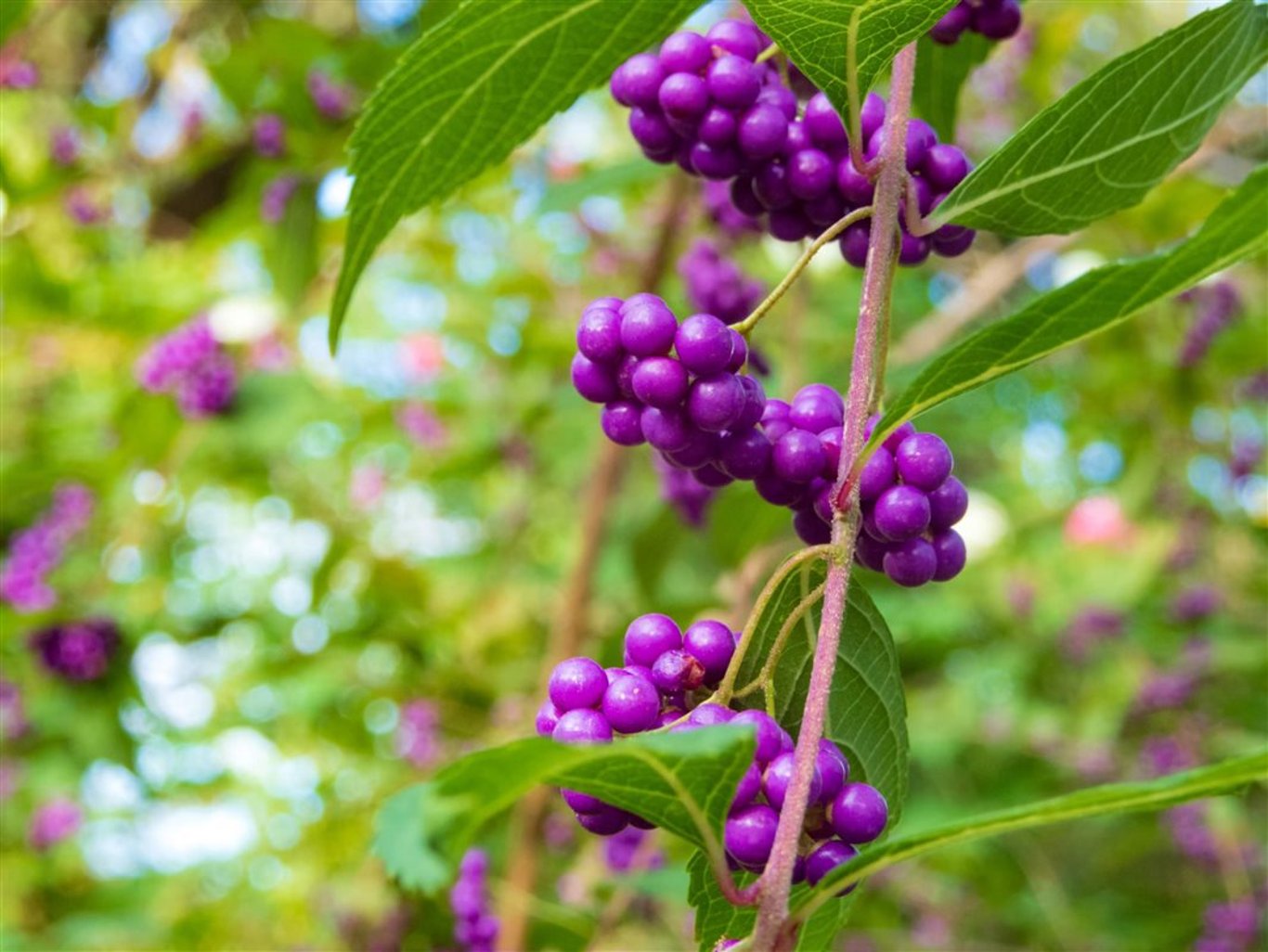 Die Callicarpa japonica, auch bekannt als Japanische Schönfrucht, ist ein Zierbaum. Dieser Baum ist bekannt für seine auffälligen violetten Beeren, die im Herbst erscheinen und einen wunderschönen Kontrast zu den Herbstblättern bilden. Die Pflanze wächst bis zu einer Höhe von etwa zwei bis drei Metern. Im Sommer blüht die Callicarpa japonica mit kleinen, lilafarbenen Blüten. Nach der Blüte entwickeln sich die Beeren, die oft bis weit in den Winter an der Pflanze bleiben und so auch in den kälteren Monaten dekorativ wirken. Dieser Baum ist aufgrund seines einzigartigen und farbenfrohen Erscheinungsbildes sehr beliebt in Gärten.