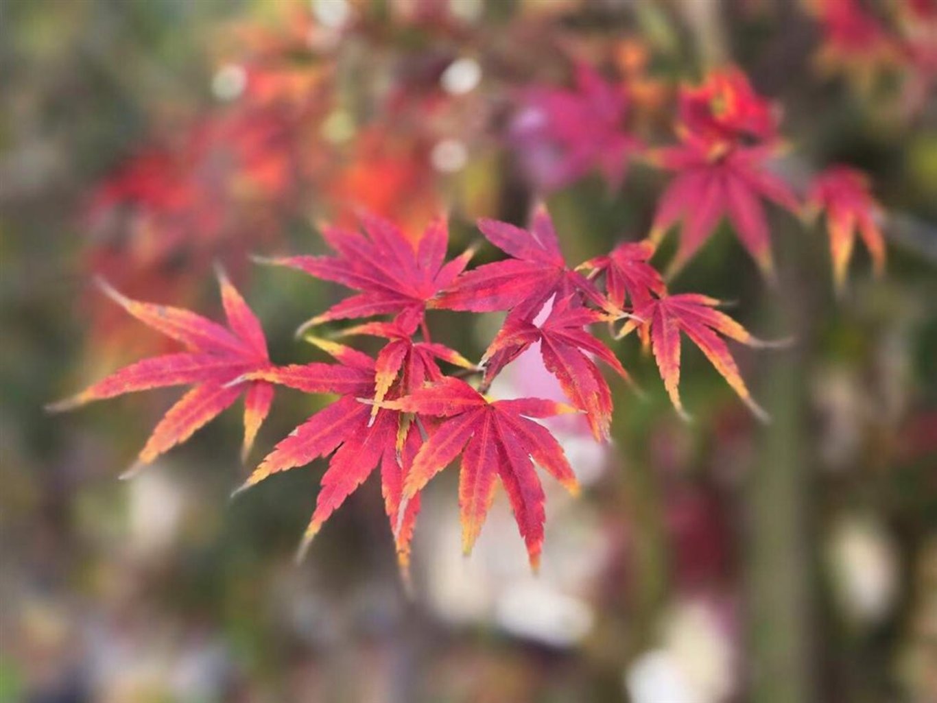 Die Blätter der ‚Arakawa‘ sind handförmig und besitzen fünf bis sieben Spitzen. Im Sommer sind sie dunkelgrün, im Herbst hingegen entwickeln sie wunderschöne Farben von Orange bis Rot, wodurch der Baum im Herbst besonders attraktiv wirkt.
