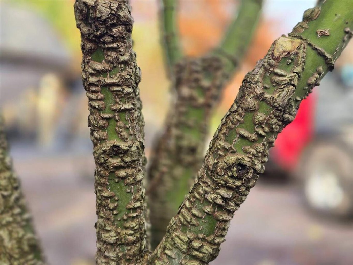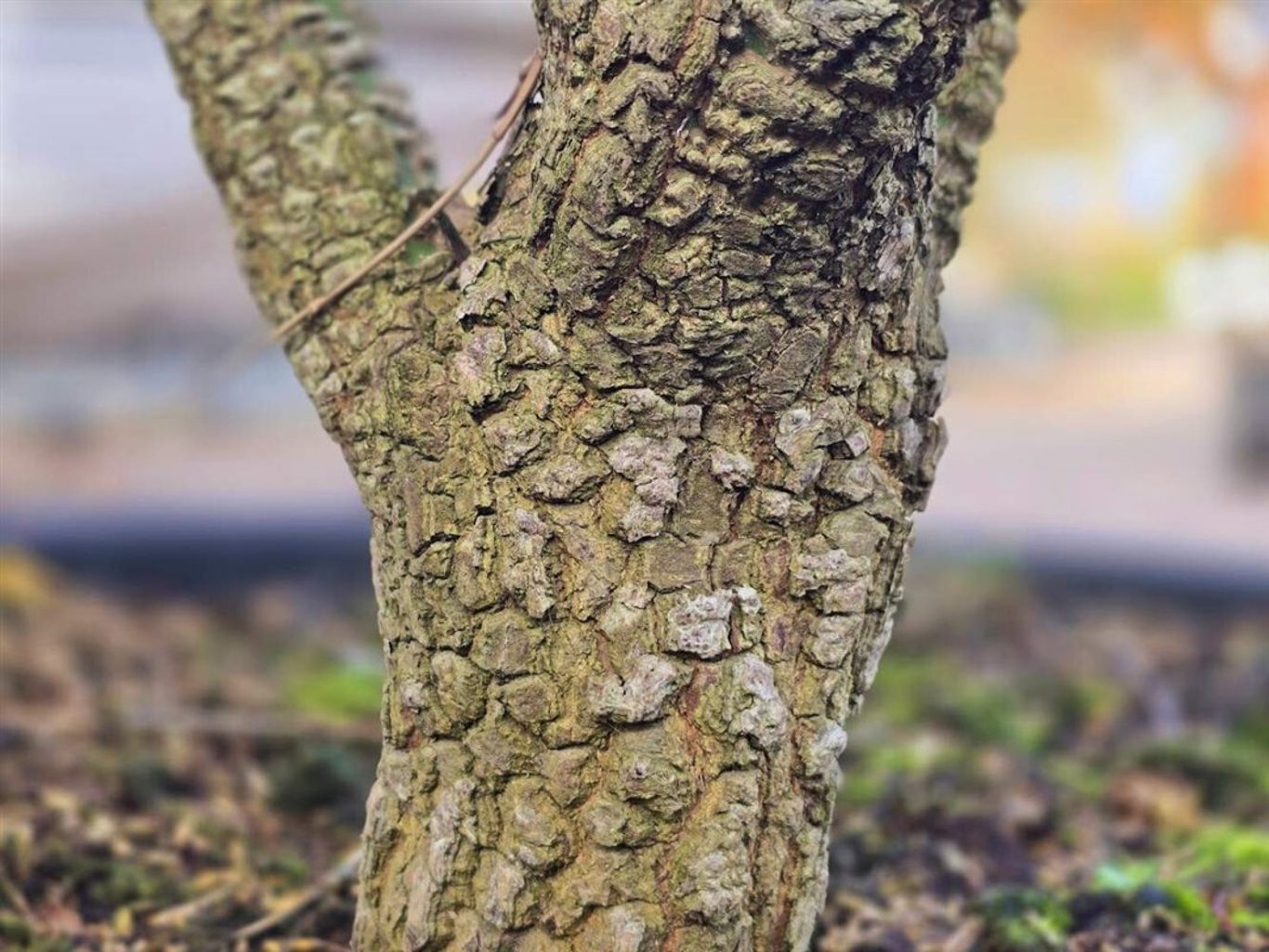 Acer palmatum ‚Arakawa‘, mehrstämmig, ist ein schöner Japanischer Ahorn, der besonders durch seine raue, graugrüne Rinde auffällt. Diese Rinde weist tiefe Furchen auf, wodurch der Baum, besonders im Alter, ein interessantes und markantes Erscheinungsbild erhält. Die Rinde gehört zu den Merkmalen, die diesen Baum einzigartig machen.