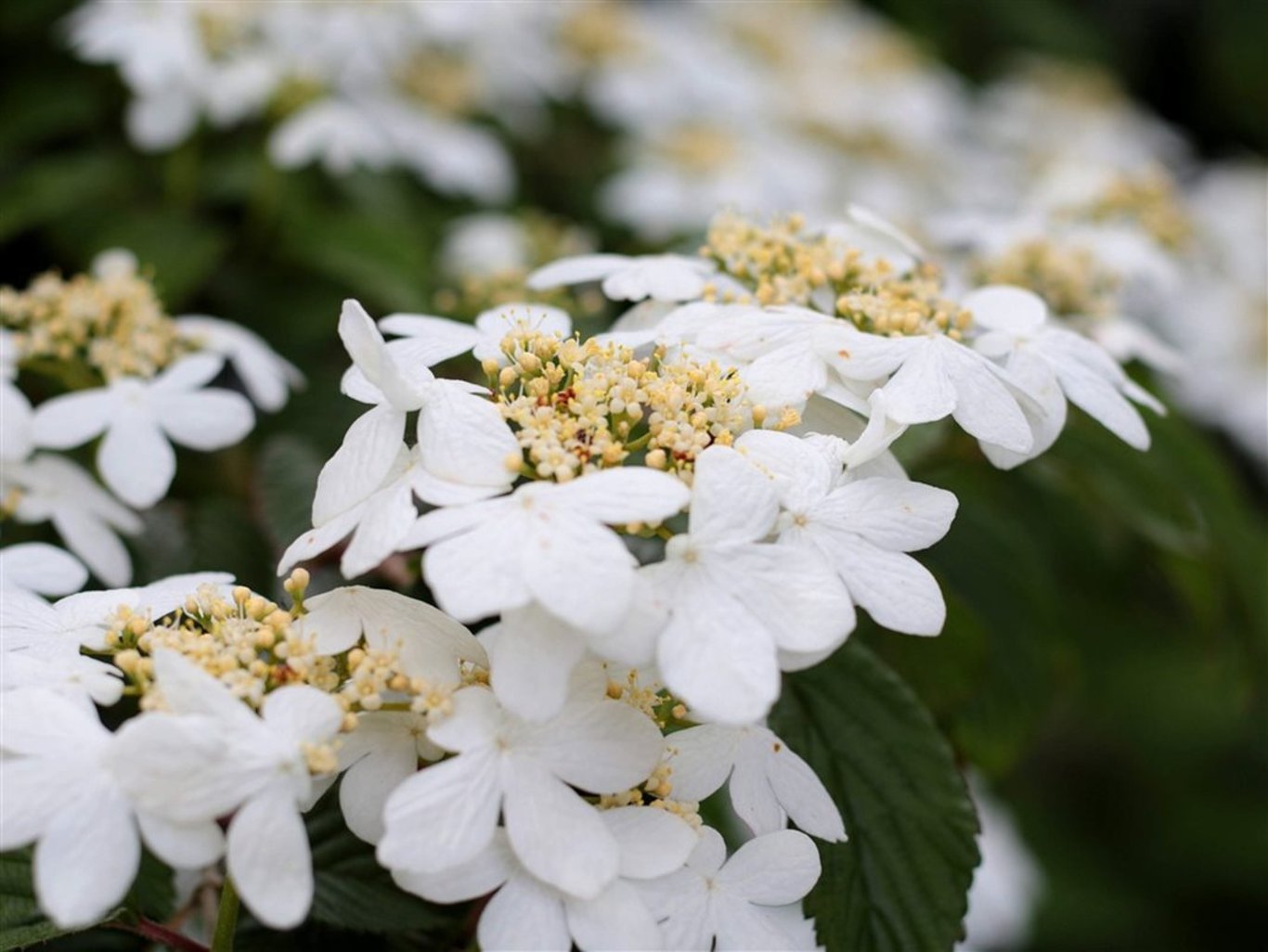 Viburnum plicatum „Mariesii“, auch bekannt als Japanischer Schneeball „Mariesii“, gehört zu den weniger hohen Schneeballarten. Die maximale Höhe liegt bei 100-150 cm. Dafür wird dieser Zierstrauch sehr breit: etwa 200-300 cm. Viburnum plicata „Mariesii“ blüht im Mai ausgiebig mit schönen weißen Blüten, die leicht duften. Dieser nicht immergrüne Strauch ist sehr winterhart, auch wenn die jungen Blätter gelegentlich von Nachtfrösten getroffen werden können. Der Japanische Schneeball gedeiht auf allen Böden, ist bedingt windfest und nicht winterhart. Die Herbstfärbung von Viburnum plicatum „Mariesii“ ist purpurrot.