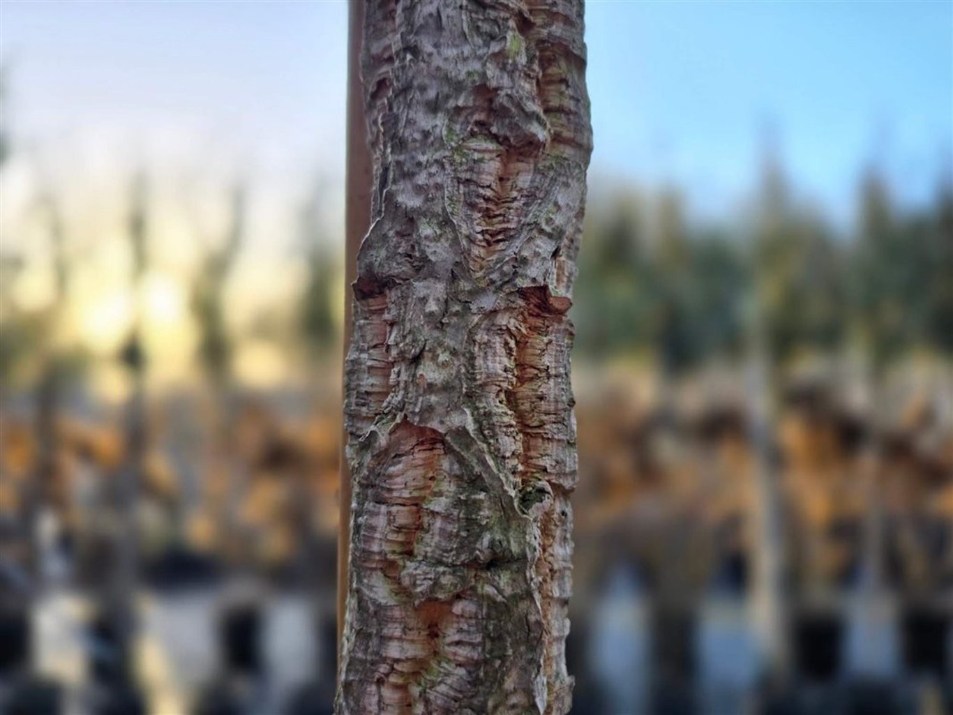 Quercus suber, mehrstämmig, besser bekannt als Korkeiche, stammt ursprünglich aus den Ländern rund um das Mittelmeer, wie Spanien, Portugal und Italien. Das auffälligste Merkmal ist die dicke, weiche Korkrinde, die wie eine raue, schwammartige Schicht die Stämme umgibt. Die Blätter sind dunkelgrün, ledrig und leicht wellig.