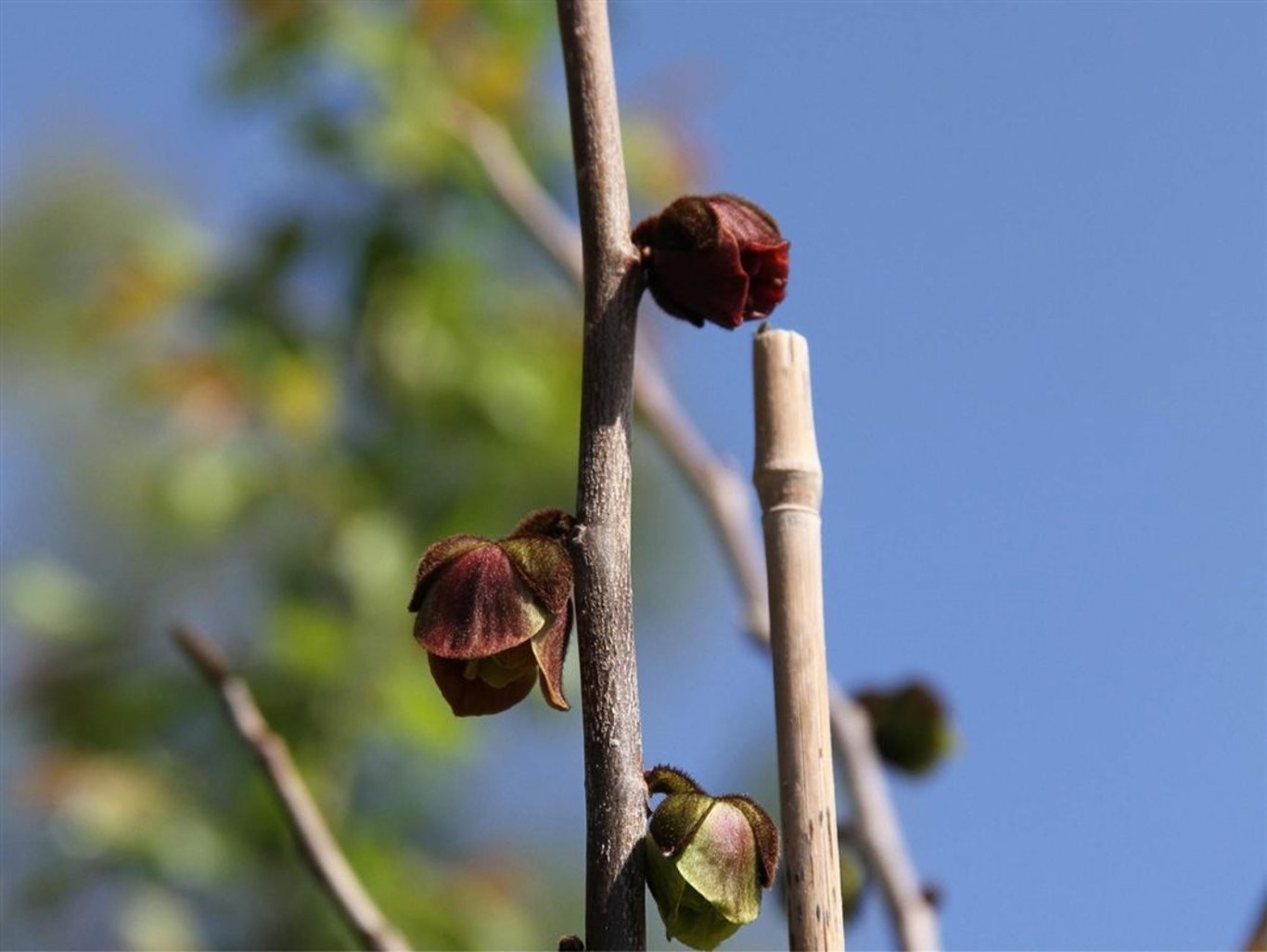 In het voorjaar verschijnen er opvallende, donkerpaarse bloemen aan de boom. Deze bloemen hebben een aparte vorm en trekken insecten aan. Na de bloei ontstaan er grote, groene vruchten die lijken op een mango of avocado. In de nazomer en herfst rijpen deze vruchten. Ze zijn eetbaar en hebben een zachte, romige smaak die doet denken aan banaan en mango.