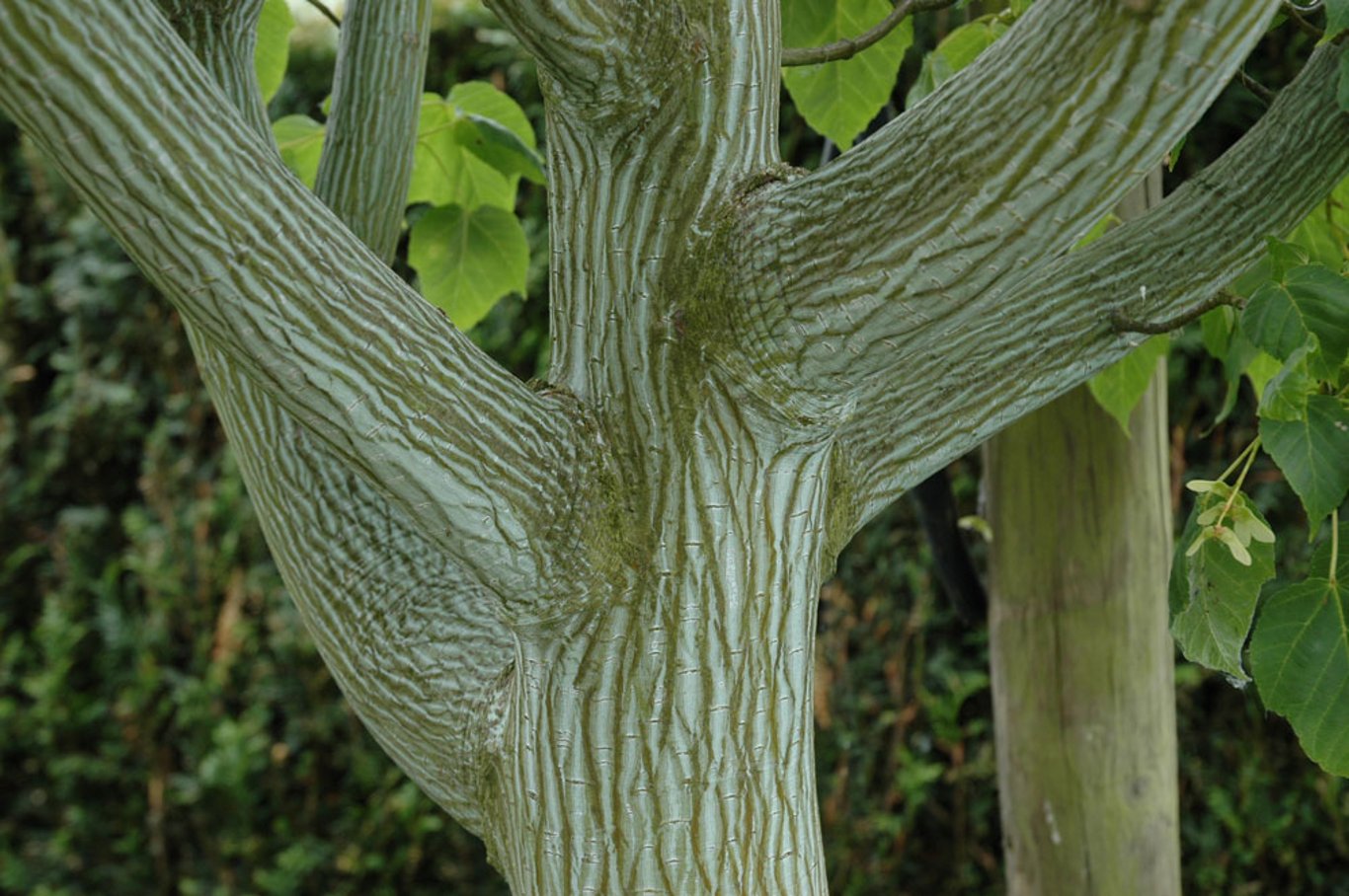 Eines der auffälligsten Merkmale des Acer rufinerve ist die Rinde. Die jungen Stämme und Zweige besitzen eine grünliche bis graugrüne Farbe mit deutlich sichtbaren, senkrechten weißen Streifen. Im Winter, wenn das Laub abgefallen ist, tritt diese Streifenzeichnung besonders stark hervor und verleiht dem Baum auch in der kahlen Jahreszeit einen hohen Zierwert. Mit zunehmendem Alter erhält die Rinde mehr Struktur und Charakter, wodurch der dekorative Effekt weiter verstärkt wird.