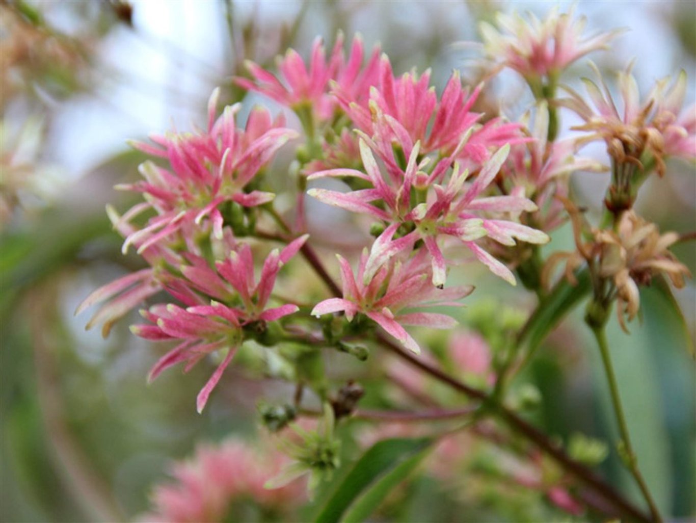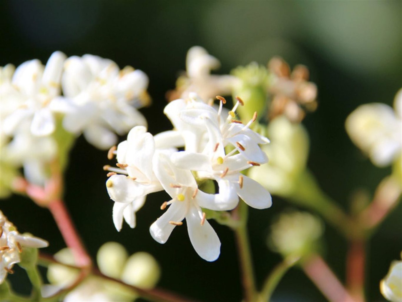 Blütenspektakel Im Frühjahr erscheinen schmale, dunkelgrüne Blätter, wodurch der Baum die Aufmerksamkeit in der Landschaft auf sich zieht. Der Sieben-Söhne-des-Himmels-Strauch blüht erst im August, wenn die meisten anderen Pflanzen nicht mehr blühen. Er trägt dann große, jeweils zu siebent in Büscheln zusammenstehende, jasminartige weiße Blüten, deren süßer Duft eine wahre Attraktion für Bienen und Schmetterlinge darstellt. Wenn die Blütenblätter im Oktober abfallen, zeigt sich ein vielleicht sogar noch schöneres Bild. Die Kelchblätter an der Basis der Blüten bleiben nicht nur stehen, sondern färben sich auch violettrot, je mehr die Samen reifen, wodurch der Eindruck entsteht, dass die Pflanze ein zweites Mal blüht. Wunderschön. Die elegante Erscheinung der Pflanze besticht schließlich ein weiteres Mal im Winter dank der sanften, braun-gelb gestreiften Rinde, wodurch die Pflanze auch zur kältesten Zeit des Jahres auffällig bleibt.