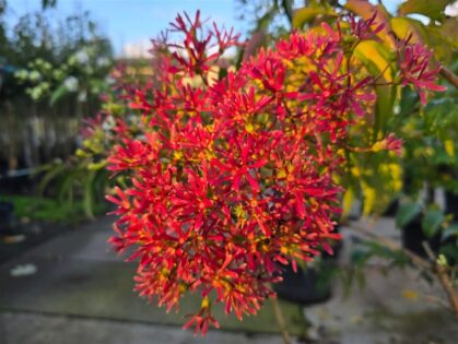 Dieser sommergrüne mehrstämmige Strauch hat eine vasenförmige Krone. Der deutsche Name dieses Strauchs lautet Sieben-Söhne-des-Himmels-Strauch. Der Strauch blüht im August…