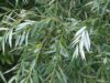 Die schmalen, lanzettförmigen Blätter der Salix alba haben eine charakteristische silbergraue bis weißliche Unterseite. Die Silber-Weide blüht im Frühjahr, meist im April, mit gelbgrünen Kätzchen.