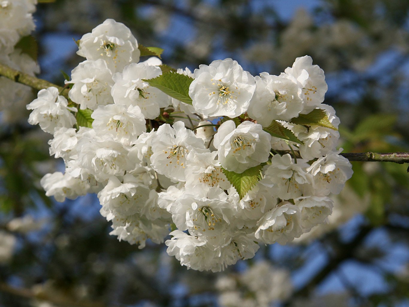 Die Blätter erscheinen danach und sind im Sommer frischgrün und färben sich im Herbst gelb bis orange. Prunus avium ‘Plena’ gedeiht am besten an einem sonnigen bis halbschattigen Standort und bevorzugt gut durchlässigen Boden. Diese Sorte bildet keine essbaren Kirschen.