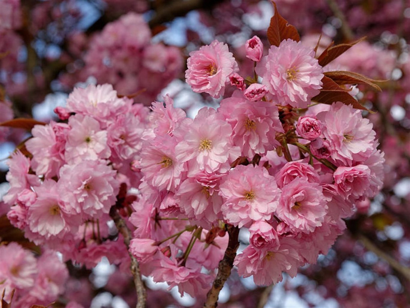 Die Blätter der Prunus serrulata ‚Kanzan‘ sind anfangs bronzefarben und verfärben sich später in ein frisches Grün. Im Herbst wechselt das Laub in leuchtende Gelb- und Orangetöne, wodurch der Baum nicht nur im Frühjahr, sondern auch im Herbst ein echter Hingucker ist.