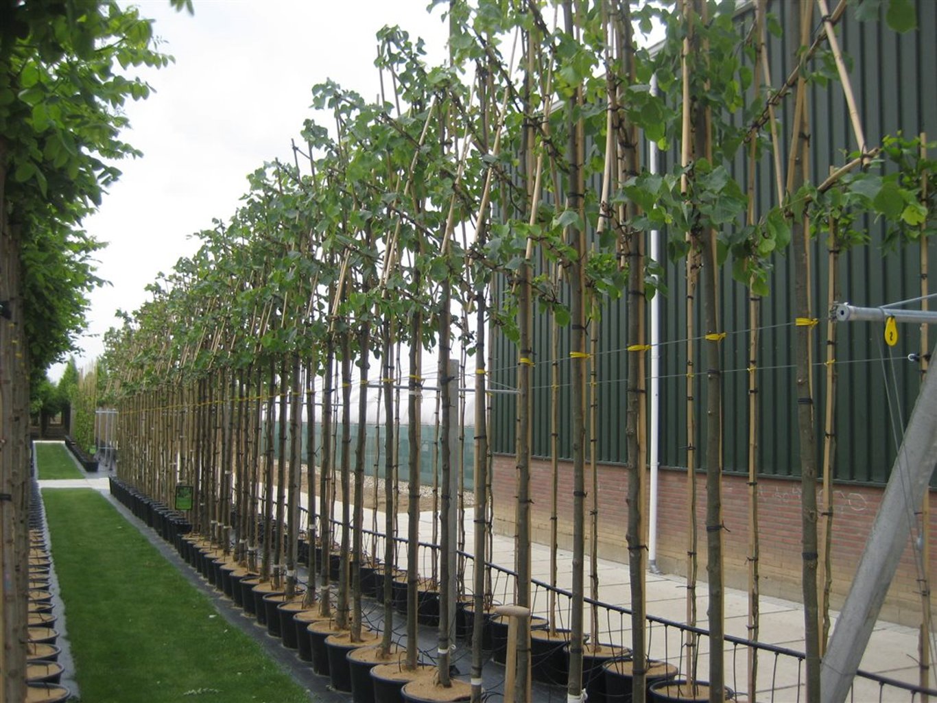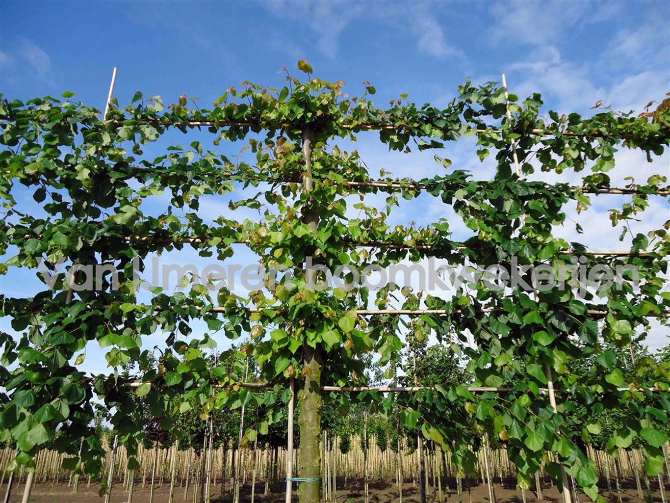 Die Tilia europaea „Pallida“ Spalier hat herzförmige grüne Blätter. Die Zweige sind zunächst gelbbraun, färben sich jedoch rasch braunrot. Für alle Böden geeignet. Wenn Sie eine Spalierlinde kaufen, wünschen Sie sich selbstverständlich einen qualitativ hochwertigen Baum. Die Spalierlinden der Baumschule van IJmeren sind robuste Linden. Da wir unsere Techniken kontinuierlich weiterentwickeln, können wir immer die besten Bäume anbieten. Spalierlinden sind selbstverständlich Teil unseres Sortiments. Die Spalierlinde hat herzförmige Blätter mit grüner Farbe und gelbbraune Äste. Diese Äste färben sich rasch braunrot. Wenn Sie sich dafür entscheiden, eine Spalierlinde bei uns zu kaufen, erhalten Sie einen robusten Baum, der sehr gut auf verschiedensten Böden gedeiht. Neben Spalierlinden bieten wir auch andere Spalierbäume an, etwa Magnolien und Platanen in Spalierform. Diese Bäume haben die gleiche Qualität wie die Spalierlinden.
