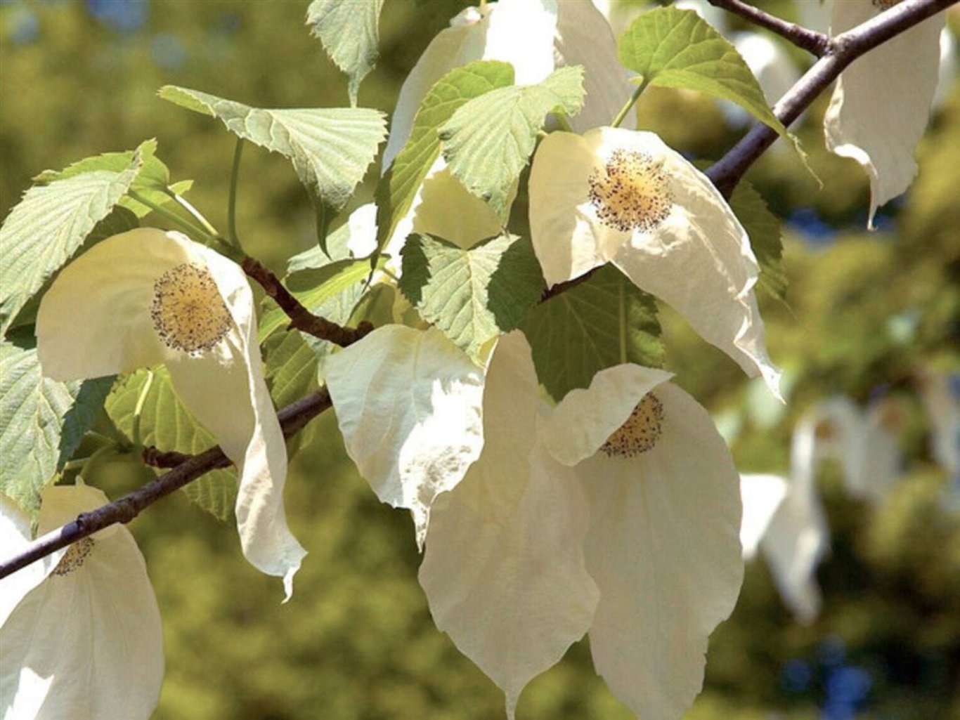 Davidia involucrata ist ein schöner, weiß blühender Baum. Seinen Namen hat er den Blüten zu verdanken, die an Taschentücher erinnern. Es handelt sich um cremefarbene hängende Hochblätter, die in ihrer Mitte eine Blütenknospe haben. Wirklich ein außergewöhnlicher Anblick. Die Blätter sind hellgrün. Der Taschentuchbaum benötigt einen fruchtbaren Boden.