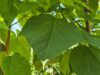 Die großen grünen Blätter, die sich Ende April entwickeln, sehen herzförmig aus. Die einzelnen Blätter können eine Breite von 20 bis 25 Zentimetern erreichen. Sie sind gegenüberliegend und wachsen am Ende der Äste. Mit langen Blattstielen mit verbreiterter Basis, hängen die Blätter nach unten. Wenn ein Blatt des Trompetenbaums gequetscht wird, verbreitet es einen Geruch, der von Mücken nicht gemocht wird. Der Baum gilt daher auch mückenabweisend.