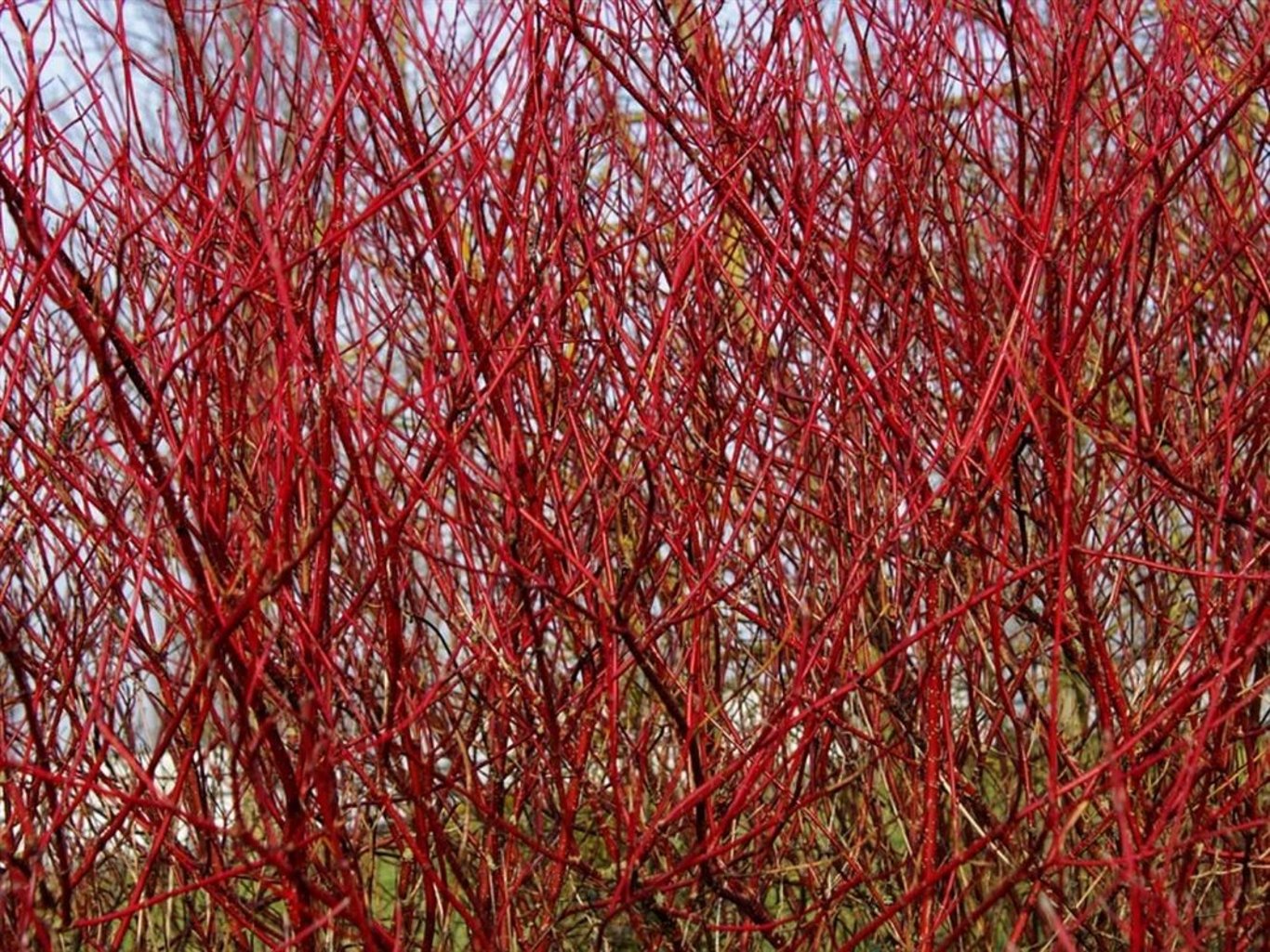 Der Strauch hat auffällige Merkmale, die ihn das ganze Jahr über interessant machen. Im Winter sind die roten Zweige der Cornus alba besonders auffällig, vor allem wenn der Rest des Gartens kahl ist. Im Frühling bildet die Pflanze kleine, weiße Blüten, die in schirmförmigen Blütenständen stehen. Nach der Blüte erscheinen rote Beeren, die besonders im Sommer und Herbst sichtbar sind.