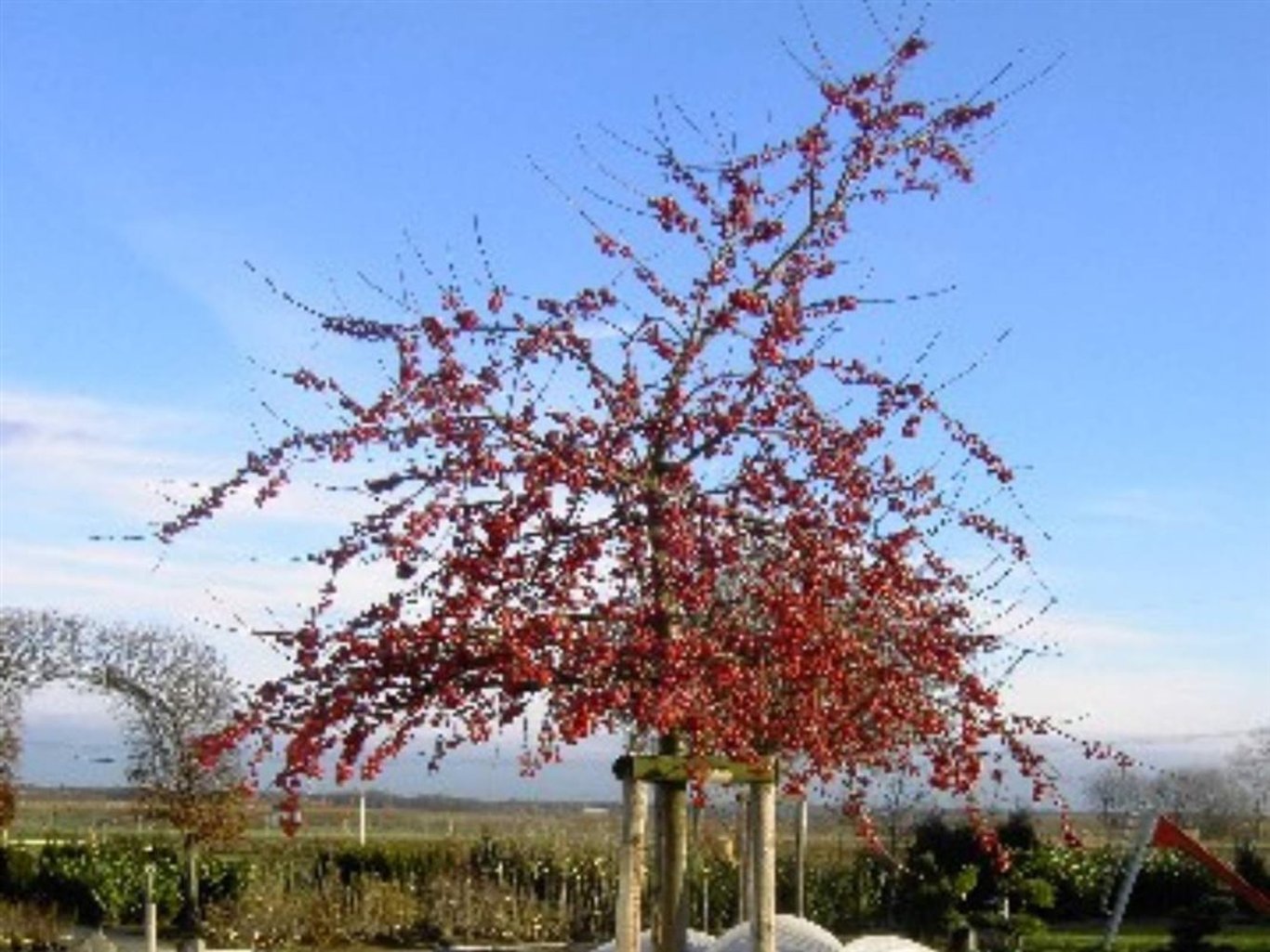 Zierapfel „Red Sentinel“ Malus red sentinel zählt zu den dekorativsten Wildapfelbäumen. Malus red sentinel ist eine besonders attraktive und ertragreiche Wildapfelsorte. Dieser rote Zierapfel ist ein robuster, kleiner Laubbaum, der im Winter die Blicke in Ihrem Garten auf sich ziehen wird. Der Baum zeichnet sich durch seine aufrechte, stolze Wuchsform, seine ausladende, verzweigte Krone und grüne Blätter aus, die sich im Herbst rot verfärben. Dieser dekorative Wildapfelbaum trägt im späten Frühjahr rosa-weiße Blüten, auf die in den Wintermonaten eine Fülle glänzender, runder, roter Früchte folgt. Die Früchte bleiben im Herbst und Winter lange am Baum und werden von der herbstlichen Laubfarbe ergänzt, bevor sie herunterfallen.